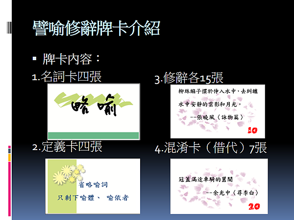 本校國文科社群從106學年度開始迄今已接近1年的時間參考台南女中馨云老師之前設計,研發出一套針對譬喻的修辭修辭牌卡Reina~小瑜兒 發表在 痞客邦 留言(0) 人氣(161)
